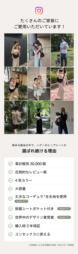 抱っこの時間が、より自由に、より心地よくなるように。Hugoo Dual Hip Seat は、日常を軽やかに支えるために生まれたデザインです。